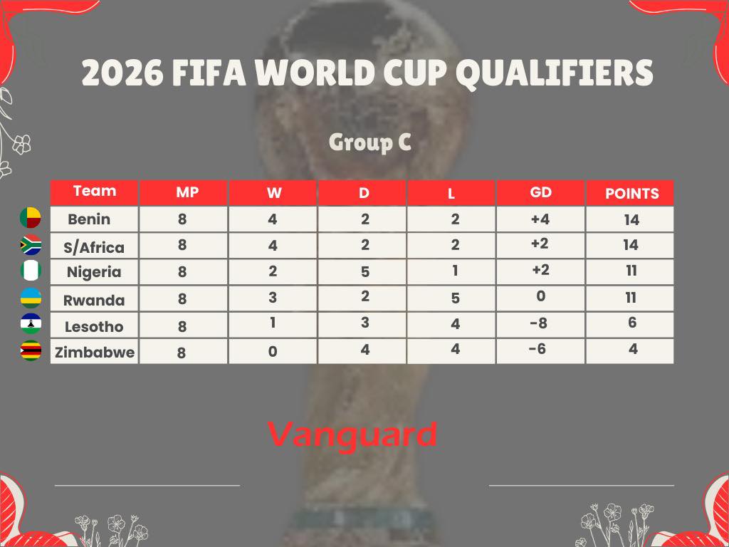 • South Africa now sits behind Benin, which holds a narrow advantage on goal difference.